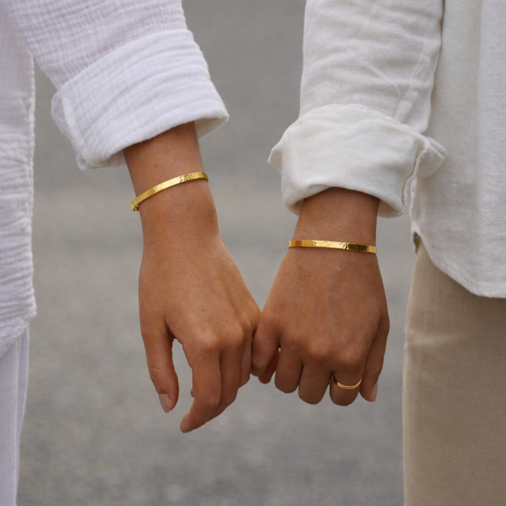 Dann ist der Armreif "Sia" perfekt dafür. Denn die Innenseite dieses Schmuckstücks kann mit einem Namen, einem Spruch oder kurzen Text deiner Wahl* graviert werden.