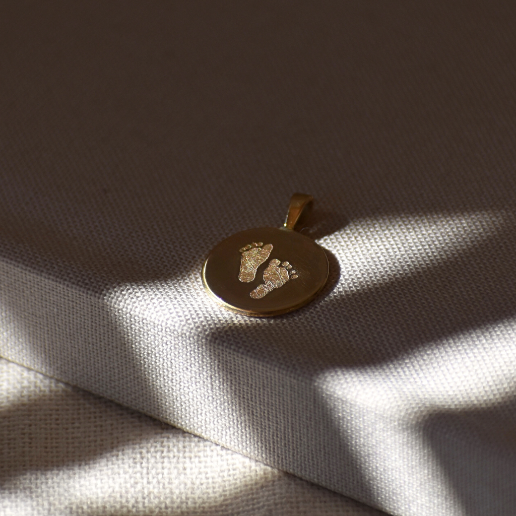 Diese wunderschöne Gravurkette mit rundem oder ovalem Anhänger ist in Handarbeit gefertigt und in recyceltem 925 Sterlingsilber, hochwertig vergoldet oder 18 Karat Echtgold erhältlich. Verewige darauf den kleinen Fuss- oder Handabdruck des neuen Erdenbewohners und erinnere dich noch lange an die besonders magische Anfangszeit mit deinem Wunder.