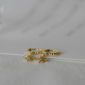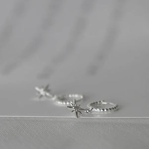 Dieses hübsche Set besteht aus einem Creolen-Paar mit Stern-Anhänger und einem kleinen Ohrring für's zweite Loch (Einzelstück).