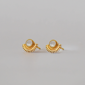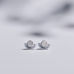 Schöne Ohrstecker mit fein glänzendem Mondstein umrahmt von zarten Strahlen, die an die Energie der Sonne erinnern.
