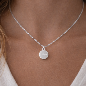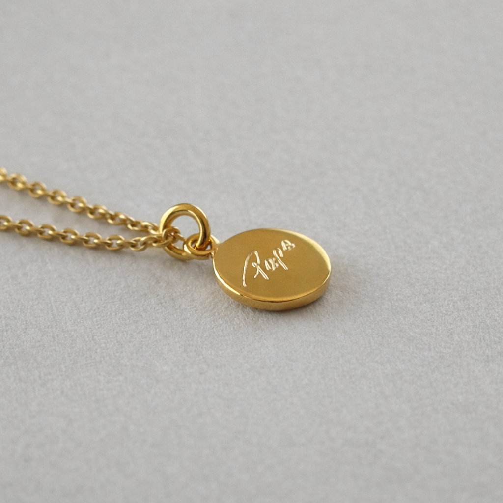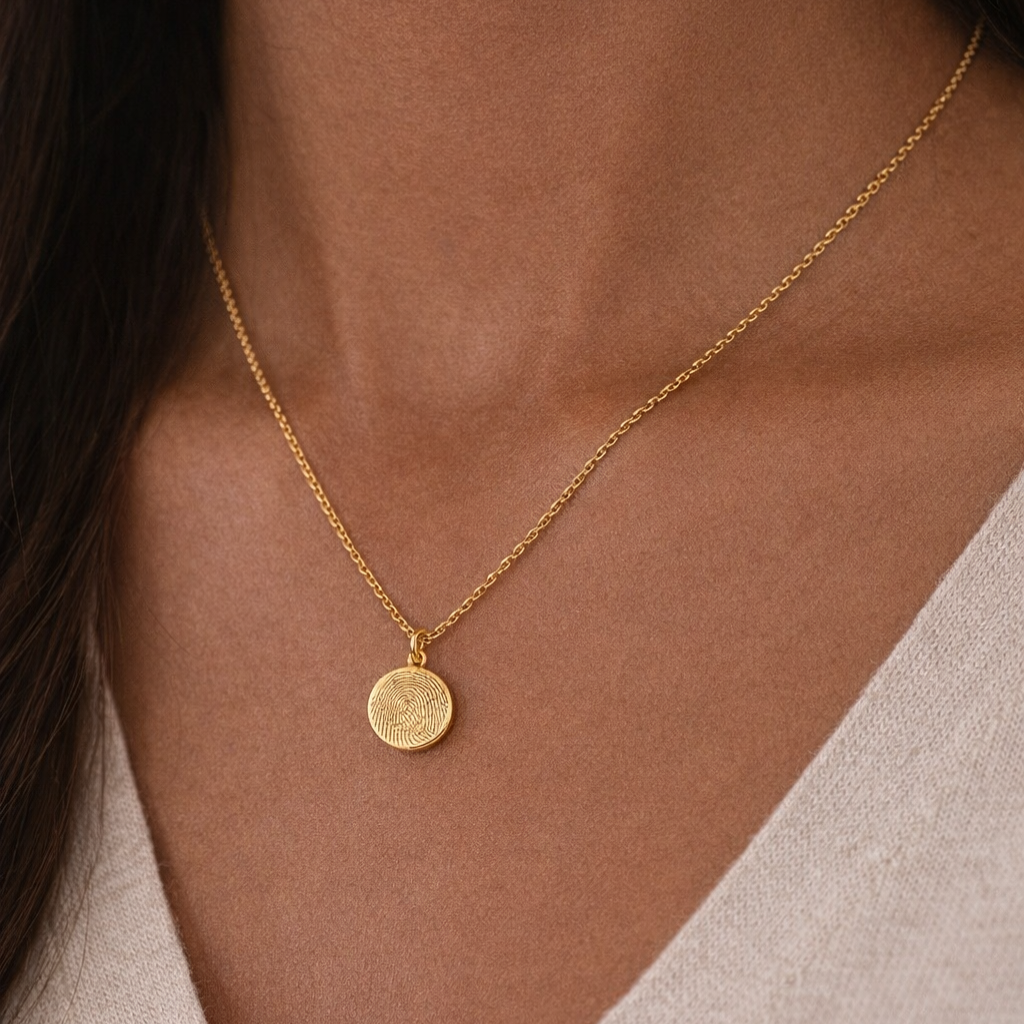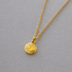 Diese wunderschöne Gravurkette mit rundem Münzanhänger ist in Handarbeit gefertigt und in recyceltem 925 Sterlingsilber, hochwertig vergoldet oder 18 Karat Echtgold erhältlich. Der Anhänger kann mit deiner persönlichen Gravur (Fingerabdruck, Hundenasenstruktur, Handschrift,...) auf der Vorder- und Rückseite veredelt werden.