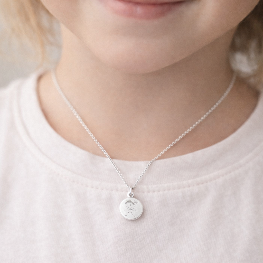 Die kleine Anhänger eignet sich in der kürzesten Kettenlänge (40cm) auch perfekt für einen kleinen Lieblingsmenschen. Zum Beispiel mit der Gravur einer selbst gemalten Zeichnung.
